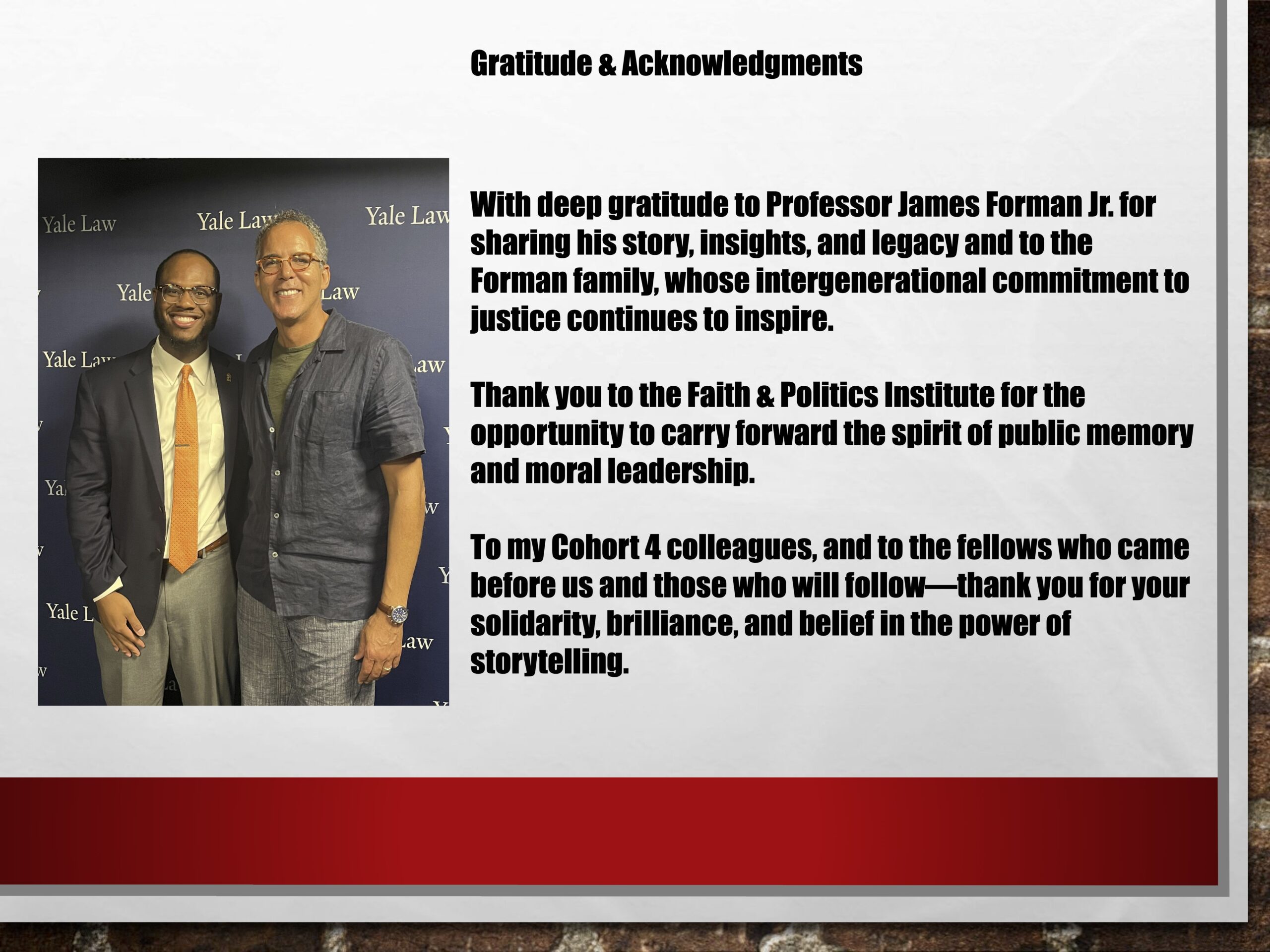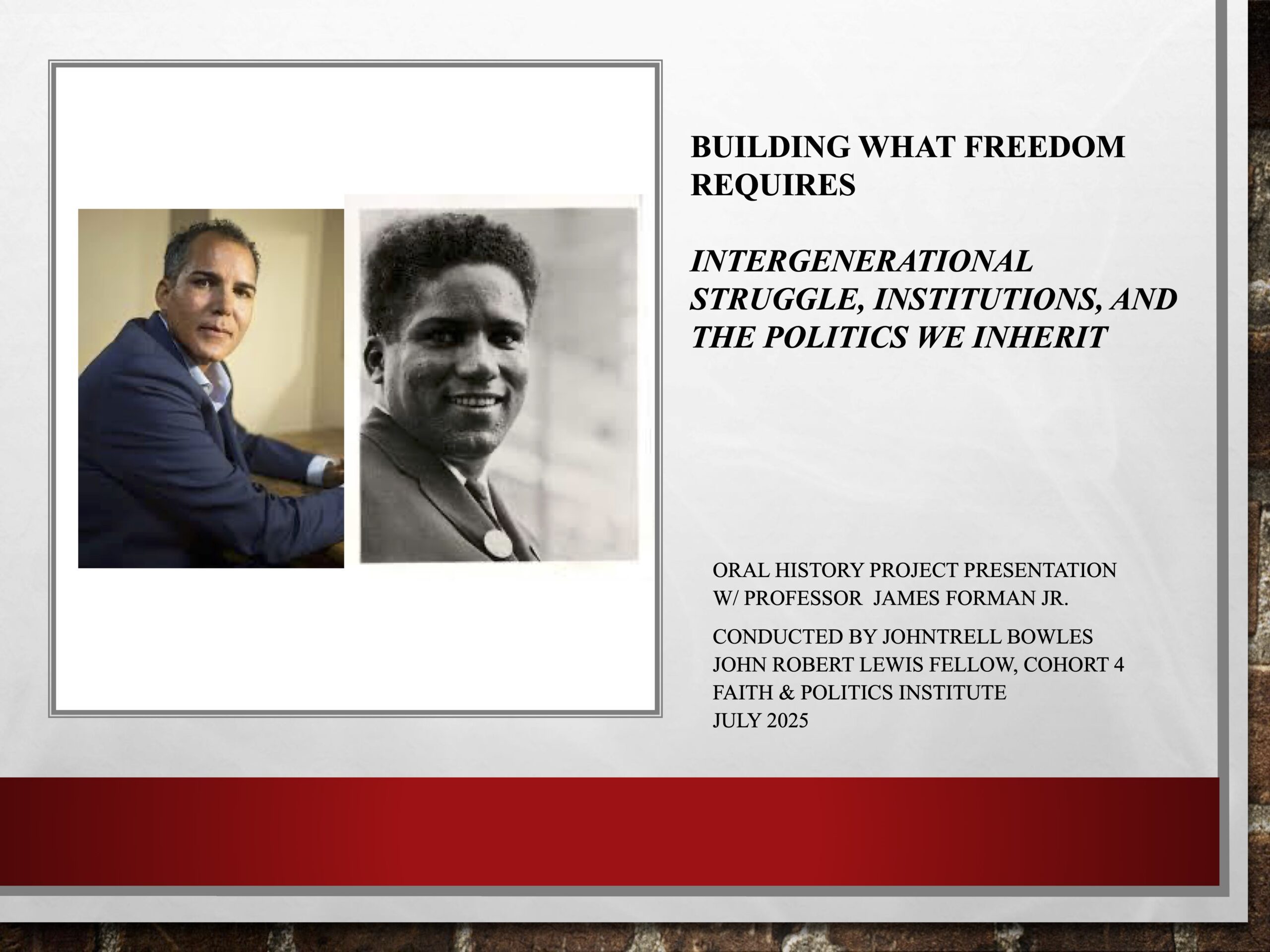 This oral history project explores the intergenerational legacy of Black political struggle through an in-depth interview with James Forman Jr.—Pulitzer Prize–winning author, Yale Law professor, and son of civil rights leader James Forman Sr. Centered on the theme “Building What Freedom Requires,” the project examines how structures of justice, memory, and education are carried forward across generations. Through reflections on law, public defense, teaching, and the founding of the Maya Angelou Schools, the interview captures how the personal and political intertwine in the ongoing work of building lasting institutions for Black freedom and collective liberation.