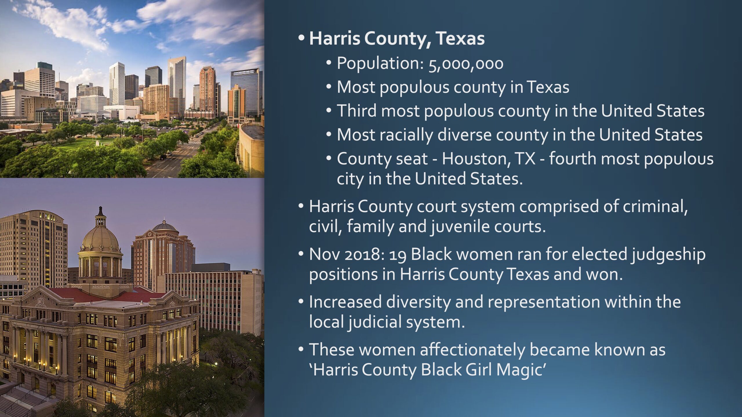 In 2018, nineteen Black women ran for elected judgeships in Harris County, Texas and won. These women affectionately became known as ‘Harris County Black Girl Magic.’ This historic election increased diversity within the local judiciary and aligned the demographics of the court system more closely to the community that it serves. Houston, Texas, the county seat, is the fourth most populous and the most racially diverse city in the United States.