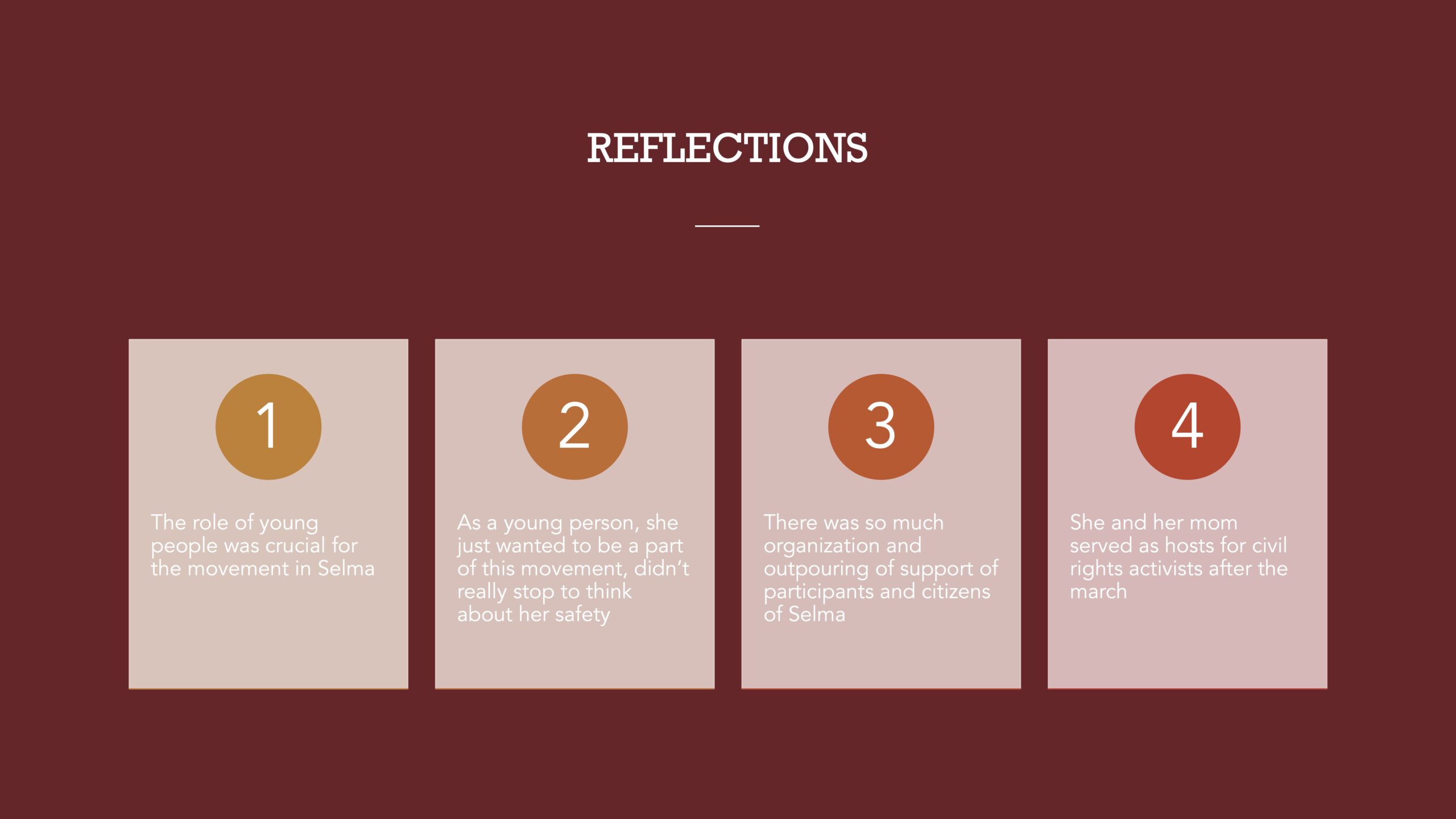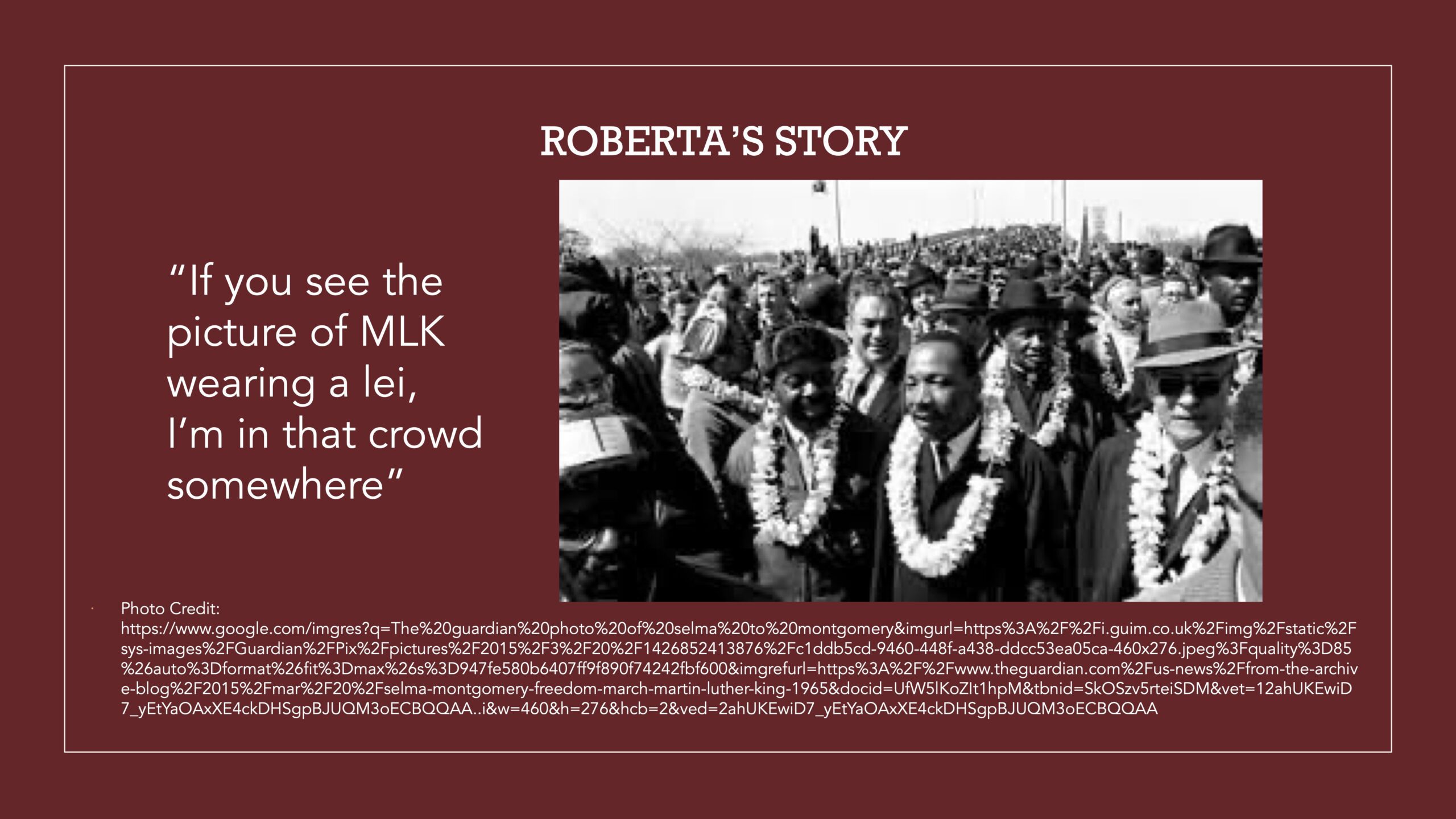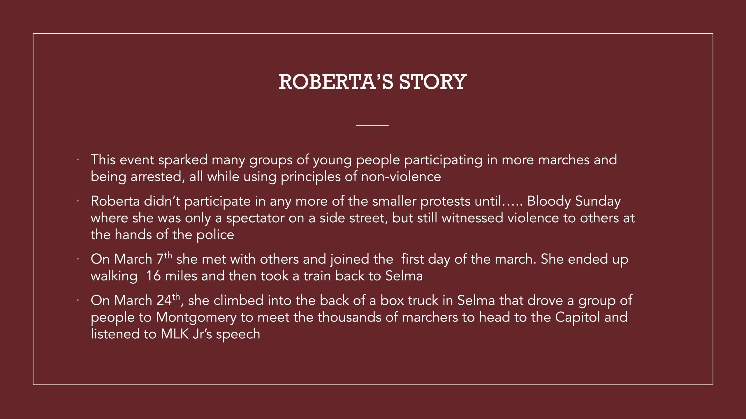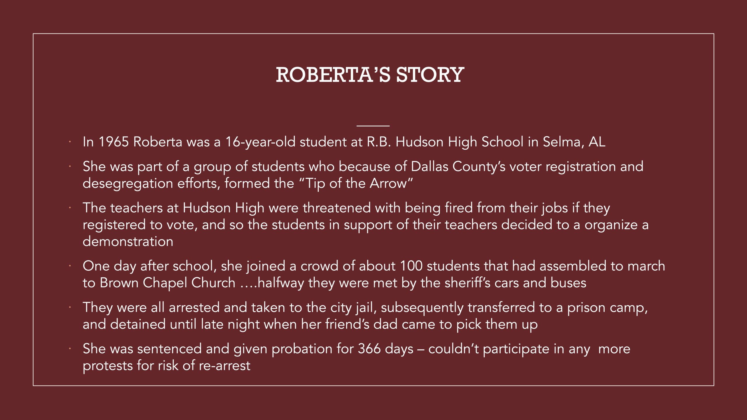 For my project I interviewed my aunt, Roberta Dawson. In 1965, she was a 16-year-old student at R.B. Hudson High School in Selma, AL. She was part of a group of students who because of Dallas County’s voter registration and desegregation efforts, formed the “Tip of the Arrow” as coined by the author Charles A. Bonner in his 2020 novel. This project describes her role as a young person in the civil rights movement in Selma, Alabama.